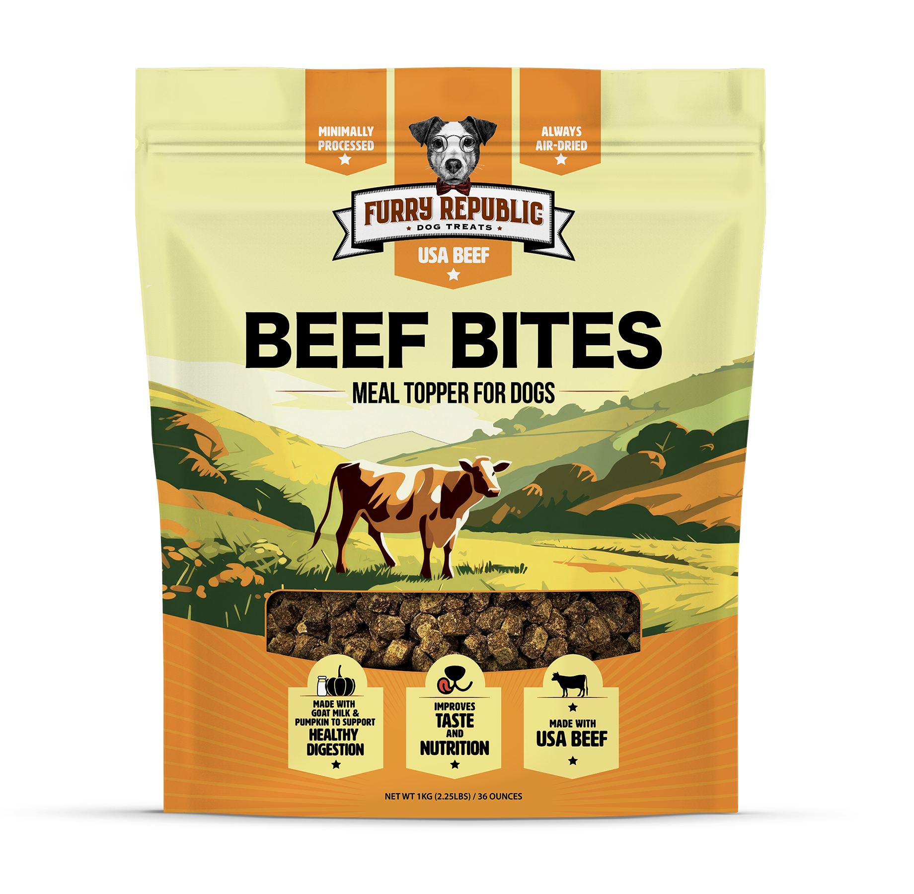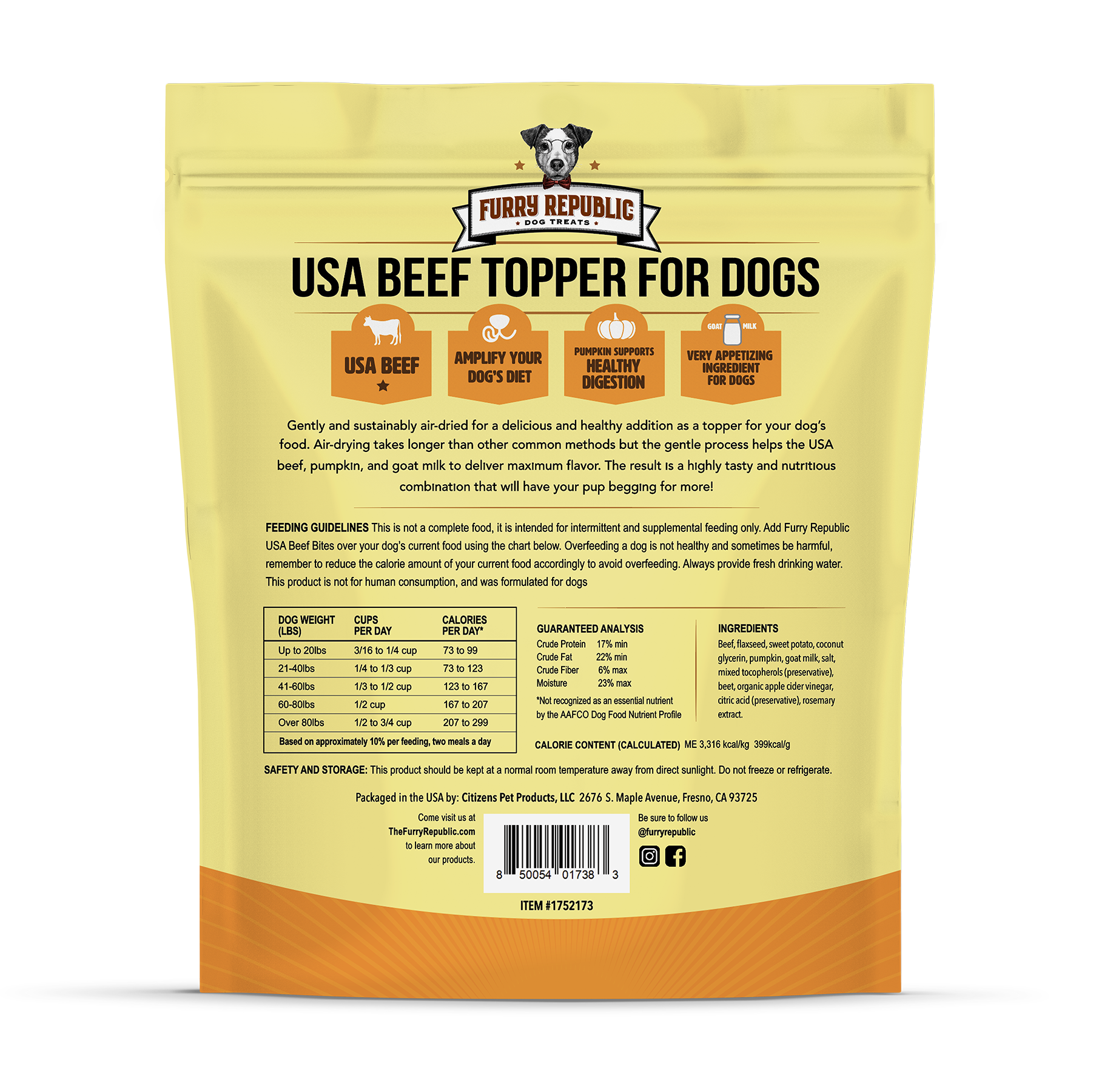 At Furry Republic, we believe every dog has the right to quality nutrition. We pledge allegiance to putting ingredients first for the healthiest, happiest dogs. Beef Meal Toppers are great for dogs of all sizes and can be used to satisfy even the pickiest of eaters. Air-dried for maximum flavor and nutrition. Grain-free, natural flavors, and no artificial colors. Healthy and delicious. Yes please!!