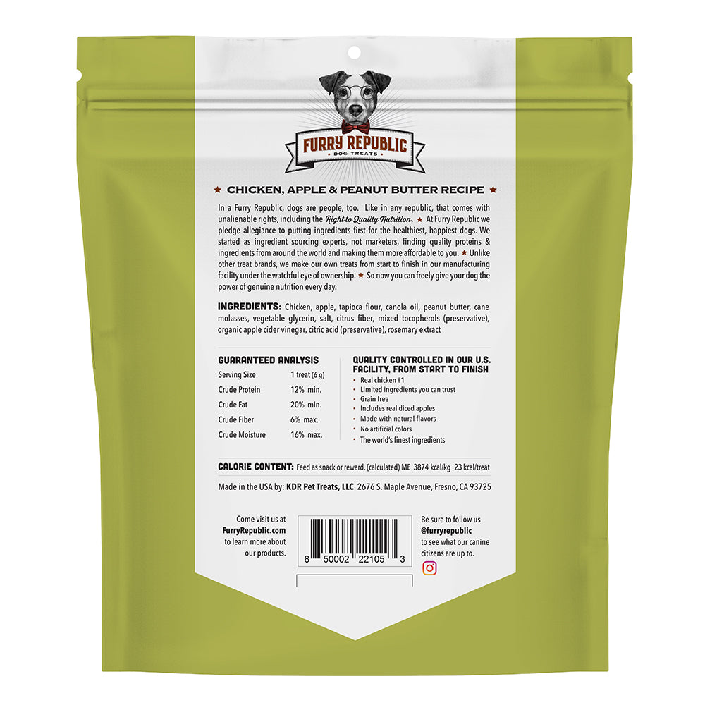Chicken, Apple, Tapioca Flour, Canola Oil, Peanut Butter, Cane Molasses, Vegetable Glycerin, Salt, Citrus Fiber, Gelatin, Mixed Tocopherols (Preservative), Organic Apple Cider Vinegar, Citric Acid (Preservative), Rosemary Extract